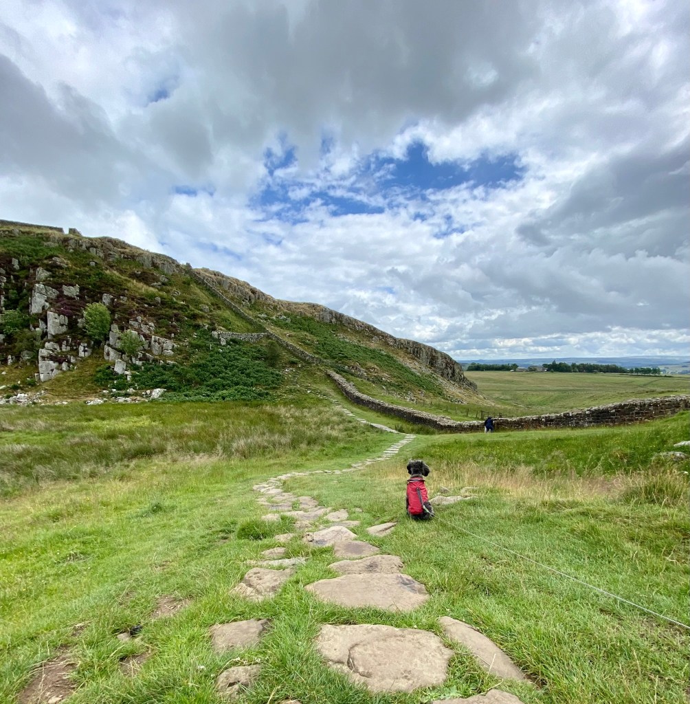 Loki, our miniature schnauzer enjoying the tranquil view in Hexham, at the foot of Hadrian’s wall before his attempt to climb. A few squeaks later, he thought better of it! The walk up is easy enough, but the steps narrow at the top and some can be a little steep. My daughter tells me the view at the top is worth seeing, but the herd of cows there were a surprise and might be a problem for travellers with small dogs in arms or bags!