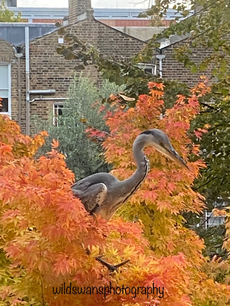 a juvenile heron turned up one morning in my garden unexpectedly, in October 2022. I was gazing out the bathroom window and there it was, resting on a bed of golden leaves in my Acer tree. Running to my bedroom, I knew I had barely seconds to grab the phone and take the shot. Acer trees, are particularly stunning in the Autumn. This is the shot.