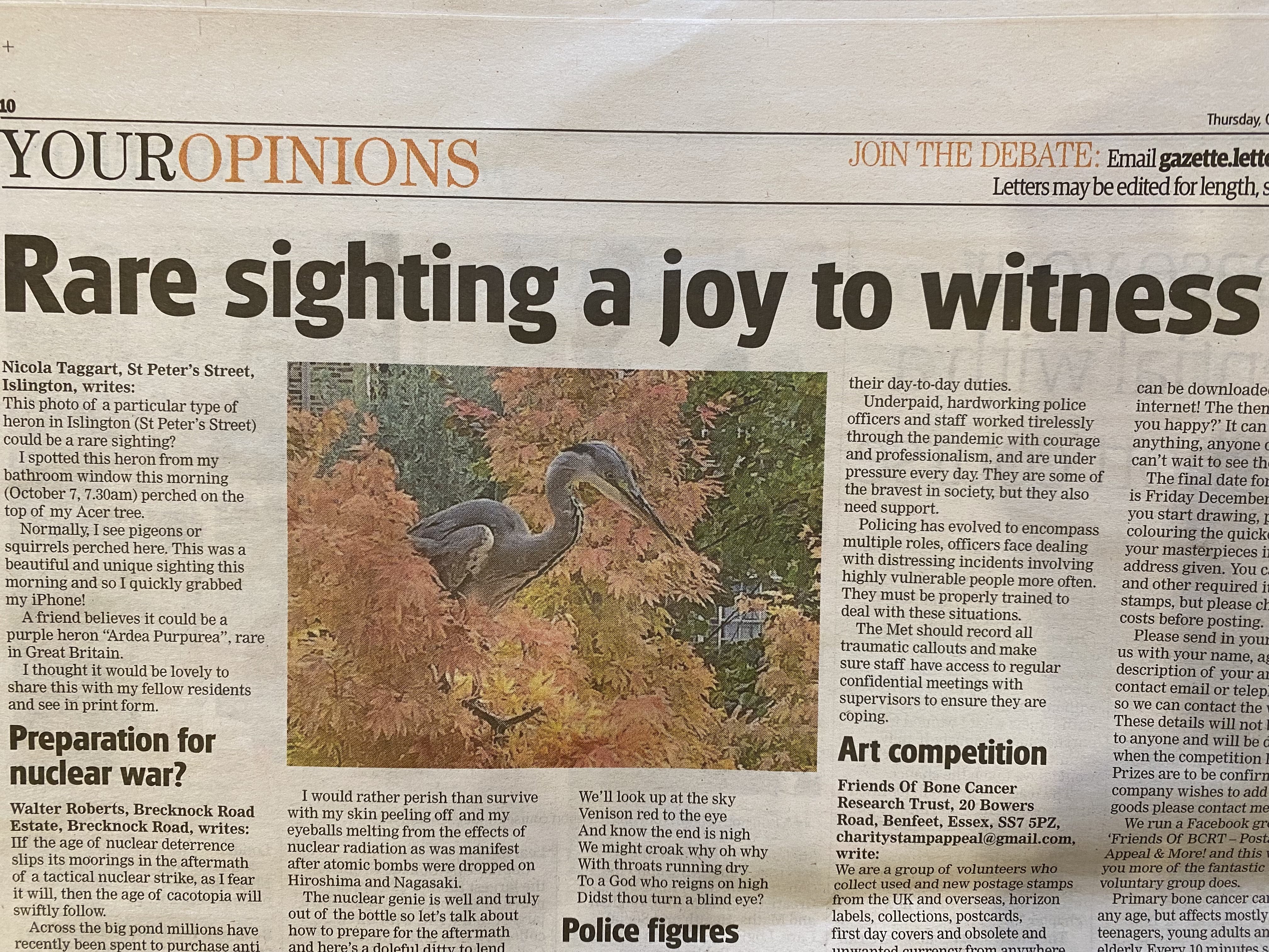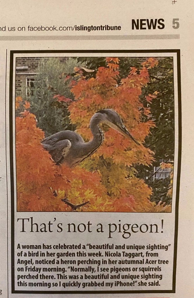 It was considered an unusual sighting so I sent the picture to local papers, a few facebook pages and the heron had its minute of fame online and in the local Gazette and Tribune. This young heron brought me luck that morning and gave me a sense of purpose when I was feeling a bit stuck. I felt it was important that locals heard about it to lift their spirits!